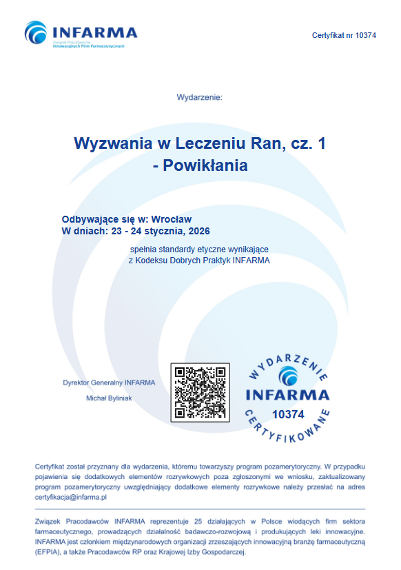 Serdecznie zapraszam na Konferencję naukowo-szkoleniową: Wyzwania w Leczeniu Ran, która odbędzie się w dniach 23-24 stycznia 2026 r. we Wrocławiu. Jej tematem przewodnim będą powikłania. Ponadto poruszone zostaną tematy typowe dla konferencji dotyczących leczenia ran, czyli m.in.: biofilm, NPWT, opatrunki specjalistyczne, antybiotykoterapia, debridement, leczenie bólu, odciążenie, kompresjoterapia itd.